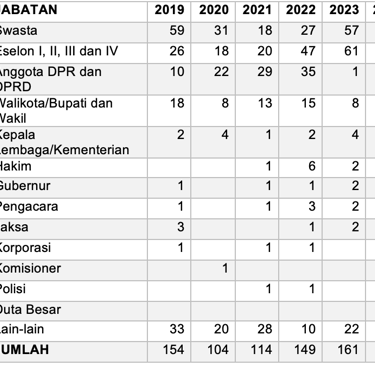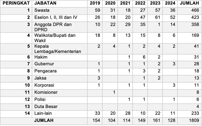 Jika kita lihat dari data di atas, pelaku tindak pidana korupsi memang tersebar di banyak kalangan dengan kelompok dengan jumlah terbanyak sebagai penyumbang pelaku tindak pidana korupsi adalah kelompok jabatan yang terafiliasi dengan instansi pemerintahan.